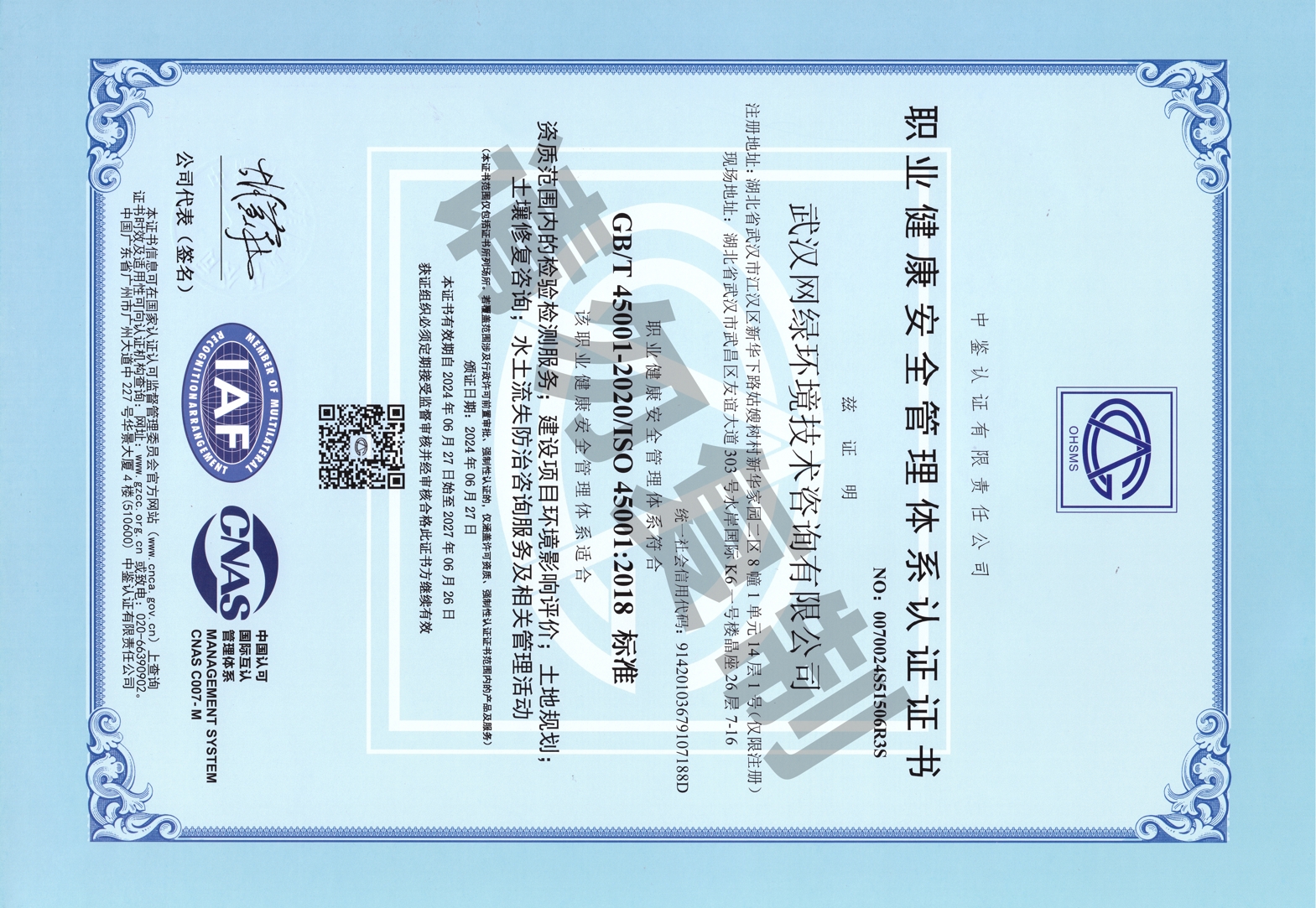 • 職業(yè)健康安全管理體系認證證書