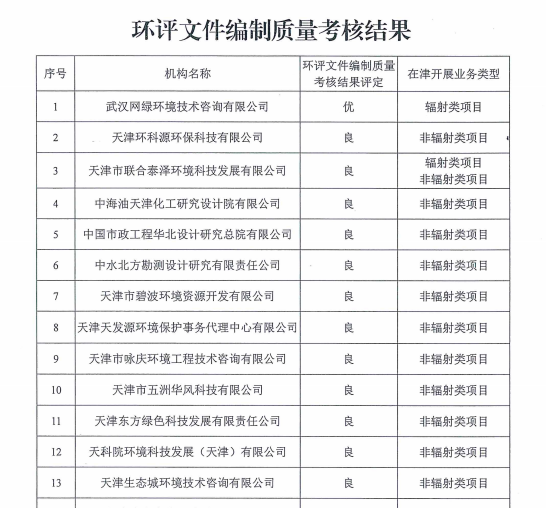 我公司在天津市環(huán)保局組織開展的2017年度環(huán)評機構(gòu)考核工作中取得優(yōu)秀的佳績。參加考核的單位共有81家,考核重點是環(huán)評文件編制質(zhì)量及環(huán)評機構(gòu)日常管理??己私Y(jié)果分為優(yōu)秀、良好、合格、不合格4個等級。在考核組的嚴格評選中,我公司以報告質(zhì)量高、服務(wù)水平優(yōu)和日常管理規(guī)范取勝,是81家參評中唯一取得優(yōu)秀的單位。